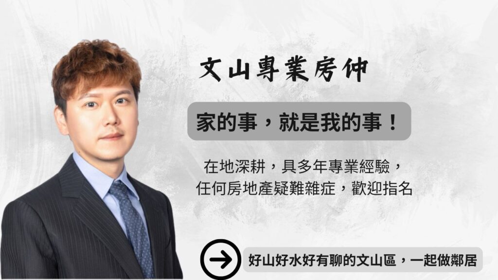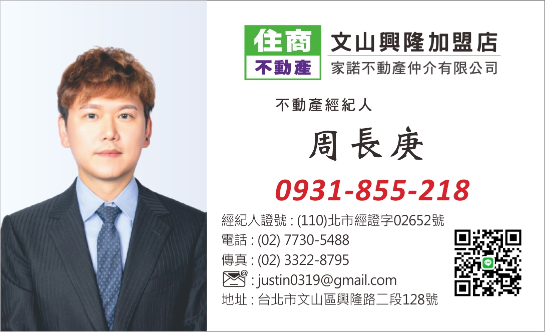 買屋 依照您的需求,提供文山區的優質物件 賣屋 完成您的期待,將房子交由下一位有緣人 租賃 做房東房客間的橋樑,交給我您放心 您好,我是文山專業房仲周長庚 不動產經紀人考試及格,文山區在地服務十五年,本身也在這裡買房,全盤了解文山區的環境、社區、學區與未來發展,能提供您最佳的建議。經過信義房屋的多年栽培,讓我一路上都抱持以人為本、先義後利的理念服務客戶,此外,交易安全也是我所重視的一環。在房仲業兢兢業業的努力,就是為了全心全意完成客戶的託付,買賣房屋與相遇都是一種緣份,長庚會抱持一期一會的態度,圓滿您的家業夢想與人生規劃。 請與我聯絡 網站文章分類 商圈介紹讓您輕鬆了解文山區各區域的特色、環境與重要設施 點我看更多 社區介紹針對各社區做全面性的介紹,可清楚知曉是否符合自身需求 點我看更多 推薦物件精選優質好案,深入介紹物件個案的特點與稀有性 點我看更多 實價登錄分析透過公開揭露的實價登錄資訊,了解各區域的價格走勢 點我看更多 免費諮詢 文山專業房仲 周長庚①Facebook粉專:https://bit.ly/3KXZ4u1 ②個人部落格:https://bit.ly/3IOer5L ③Line官方帳號:@698hbfbo④E-mail:justin0319@gmail.com