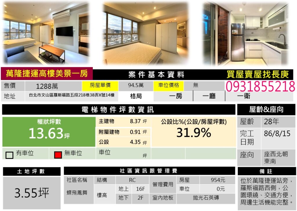 地理位置 蝶飛鳳舞社區位於文山區羅斯福路五段218巷38弄,近萬隆捷運站4號出口(有手扶梯),步行約200M, …